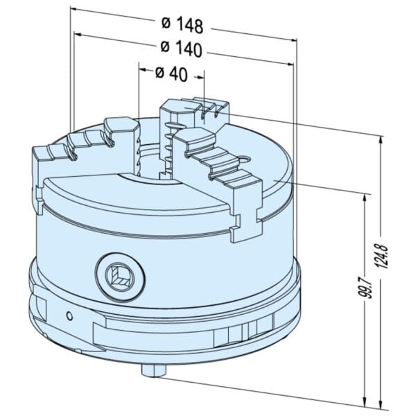 Manually operated three-jaw chuck ø140mm. Central clamping range 3-53mm. Body made of steel. High concentric accuracy according to DIN 6386. Fitted to pallet ø 148 G. Including 3 hardened drilling jaws (outward stepped), 3 hardened turning jaws (inward stepped) and 1 wrench.