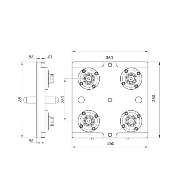 Erowa ER-036345 Compatible 4-head Heavy Duty Pneumatic Chuck Base. Rapid Holding Systems Erowa compatible 4 head heavy pneumatic CNC pallet makes job easier because it allows to arrange 4 chucks on single pallet.